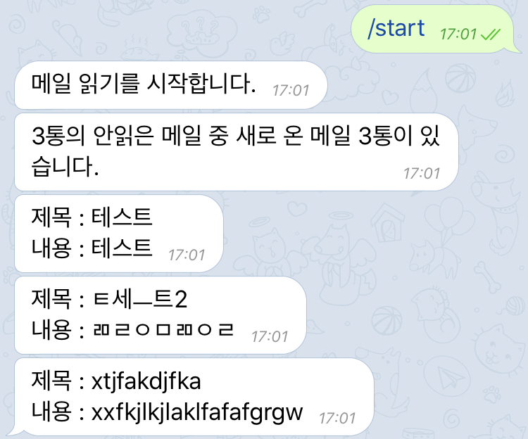 나는 start 명령어를 입력받았을 때 수신자로부터 chat_id를 받아와 저장하고 저번 편에서 만들었던 ParseMail을 사용한 무한 루프 메일체크 함수를 구동하게 만들었다. 원하는 방식대로 사용하면 좋을 듯 하다.